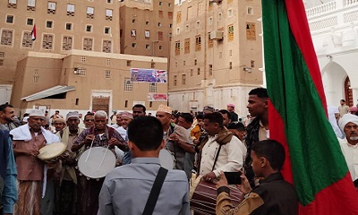 الناس في موكب واحد في أكبر ساحات شبام في مظهر قلما نراه إلا في يومين من