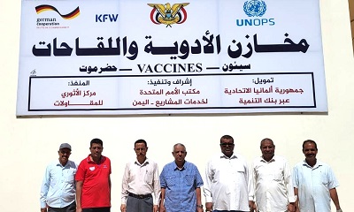 اطلع مدير عام مكتب وزارة الصحة العامة والسكان بحضرموت الوادي والصحراء الدكتور هاني خالد العمودي اليوم على التركيبات النهائية من تركيب غرفة التجميد الخاصة بحفظ اللقاحات بمخازن حفظ اللقاحات بأدارة برنامج التحصين بمكتب وزارة الصحة بمحافظة حضرموت الوادي والصحراء، بمدينة سيئون ضمن مشروع إعادة تأهيل مخازن اللقاحات التابعة لمكتب وزارة الصحة العامة والسكان بحضرموت الوادي والصحراء، المموّل من جمهوريه المانيا الاتحادية من بنك التنمية الالمانيKFW تنفيذ مكتب الامم المتحدة لخدمات المشاريع ( UNOPS) .